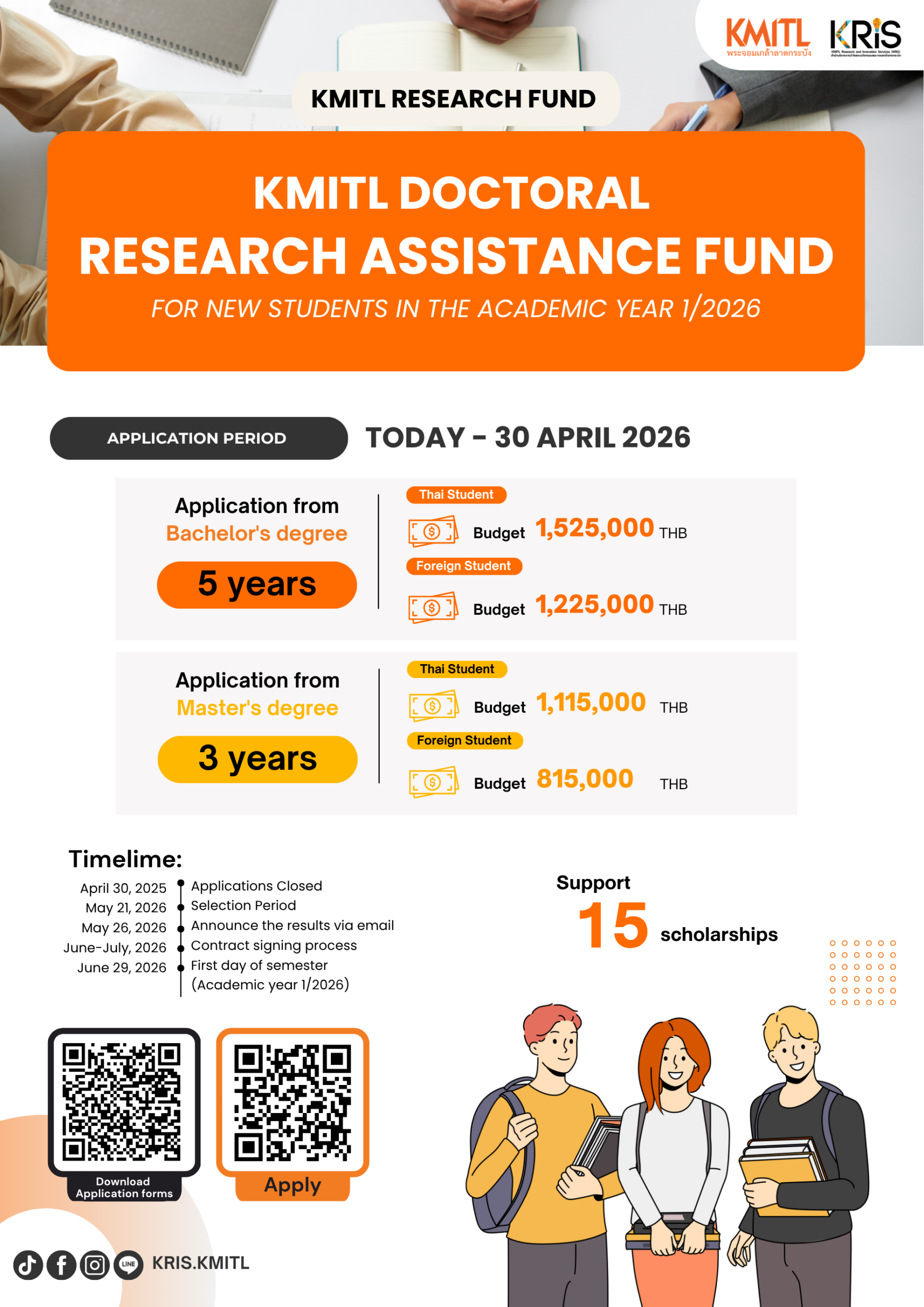 กองทุนวิจัย สจล. เปิดรับสมัครทุนสนับสนุนการวิจัยสำหรับอาจารย์ที่ปรึกษาของ “ผู้ช่วยวิจัยระดับบัณฑิตศึกษา” (ปริญญาโท)