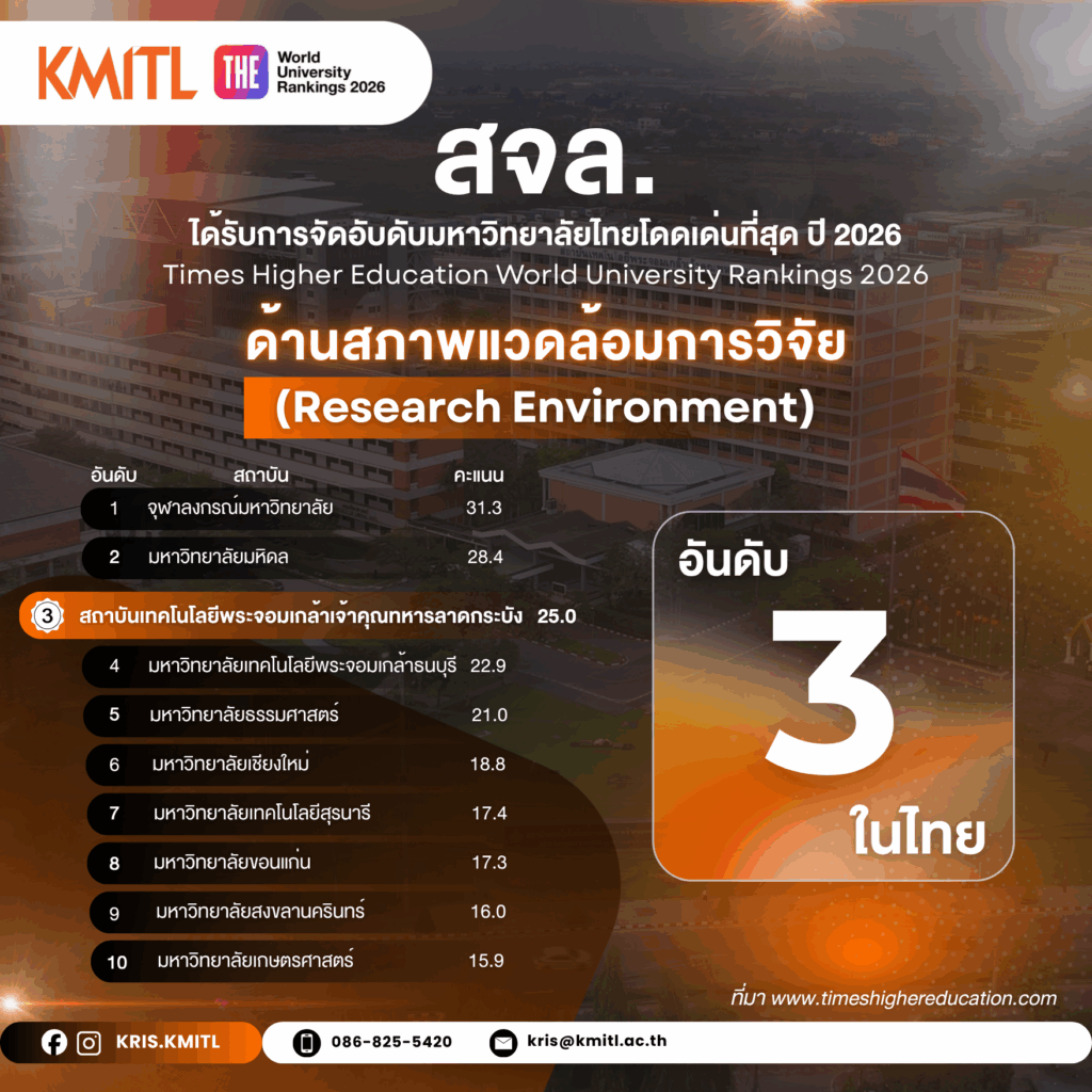 สจล. ได้รับการจัดอันดับ “มหาวิทยาลัยไทยโดดเด่นที่สุด ปี 2026” 🇹🇭 ด้านสภาพแวดล้อมการวิจัย (Research Environment)