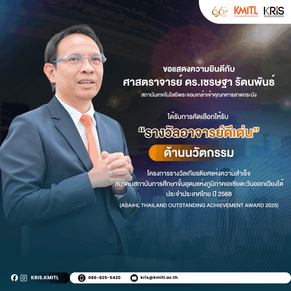 ขอแสดงความยินดีกับ ศาสตราจารย์ ดร.เชรษฐา รัตนพันธ์ สถาบันเทคโนโลยีพระจอมเกล้าเจ้าคุณทหารลาดกระบัง ขอแสดงความยินดีกับศาสตราจารย์ ดร.เชรษฐา รัตนพันธ์สถาบันเทคโนโลยีพระจอมเกล้าเจ้าคุณทหารลาดกระบัง ที่ได้รับการคัดเลือกให้รับรางวัลอาจารย์ดีเด่น “ด้านนวัตกรรม” จากโครงการ รางวัลเกียรติยศแห่งความสำเร็จสมาคมสถาบันการศึกษาขั้นอุดมแห่งภูมิภาคเอเชียตะวันออกเฉียงใต้ประจำประเทศไทย ปี 2568(ASAIHL Thailand Outstanding Achievement Award 2025)ขอชื่นชมในความมุ่งมั่น ทุ่มเท และบทบาทสำคัญในการขับเคลื่อนงานนวัตกรรมของประเทศอย่างต่อเนื่องและโดดเด่นKRIS พร้อมร่วมสนับสนุนอาจารย์และนักวิจัยในการพัฒนาองค์ความรู้ […]
