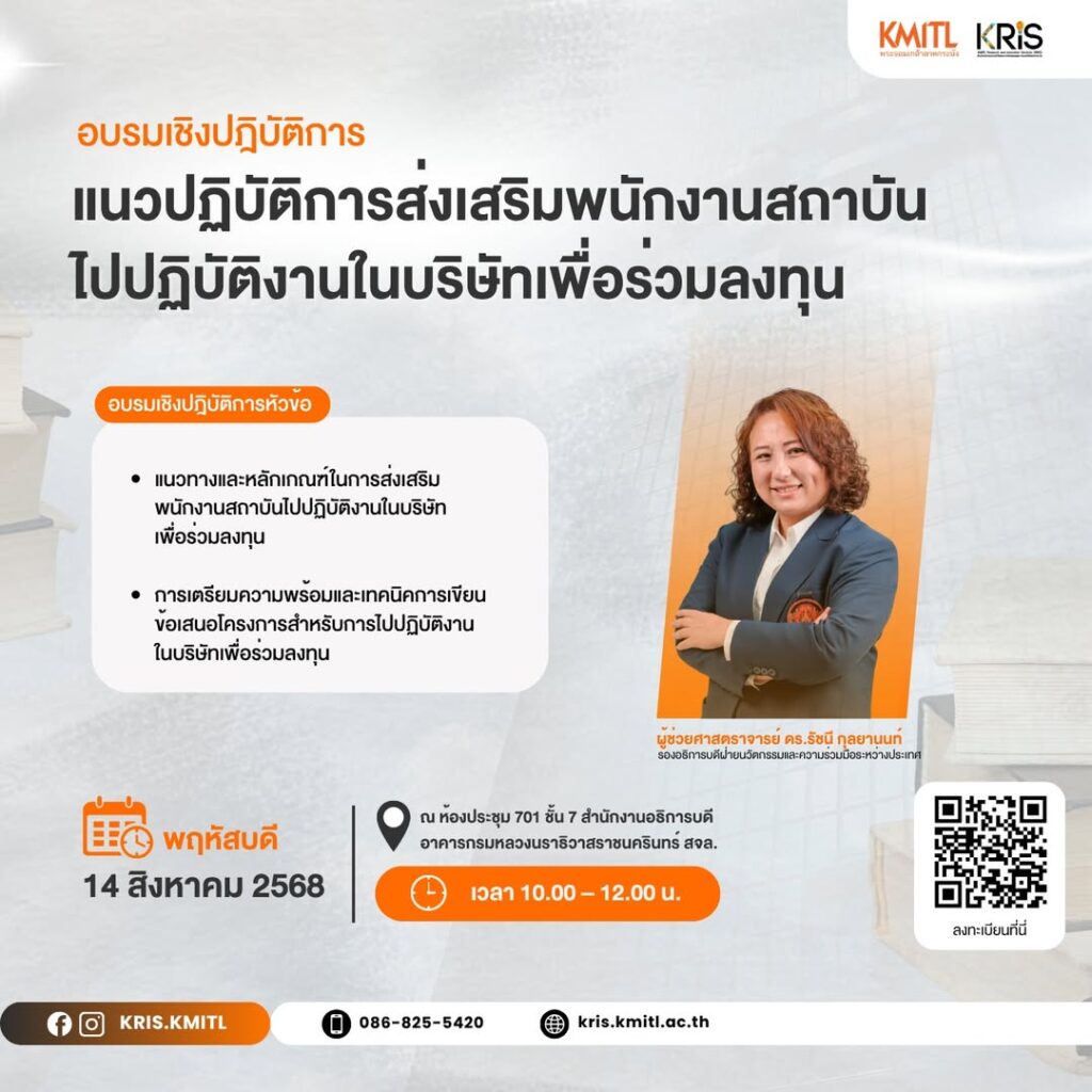 🚀✨ สจล. โชว์ศักยภาพนวัตกรรมไทยในงาน IP FAIR 2025 นักวิจัยไทย…ยกระดับไอเดียสู่ผลงานทรัพย์สินทางปัญญา 💡 นักวิจัยไทย…ยกระดับไอเดียสู่ผลงานทรัพย์สินทางปัญญา .Zone : TISCพบกับไอเดียผลิตภัณฑ์แปรรูปจากมะม่วงมหาชนกและการใช้ประโยชน์เศษเหลือจากกระบวนการผลิต “เยลลี่มะม่วงมหาชนก” เพื่อสุขภาพเพิ่มไฟเบอร์ “ชาเปลือกมะม่วงมหาชนก” ต้านอนุมูลอิสระ “มะม่วงผง” เพิ่มมูลค่า เก็บง่าย ใช้ได้หลากหลาย […]