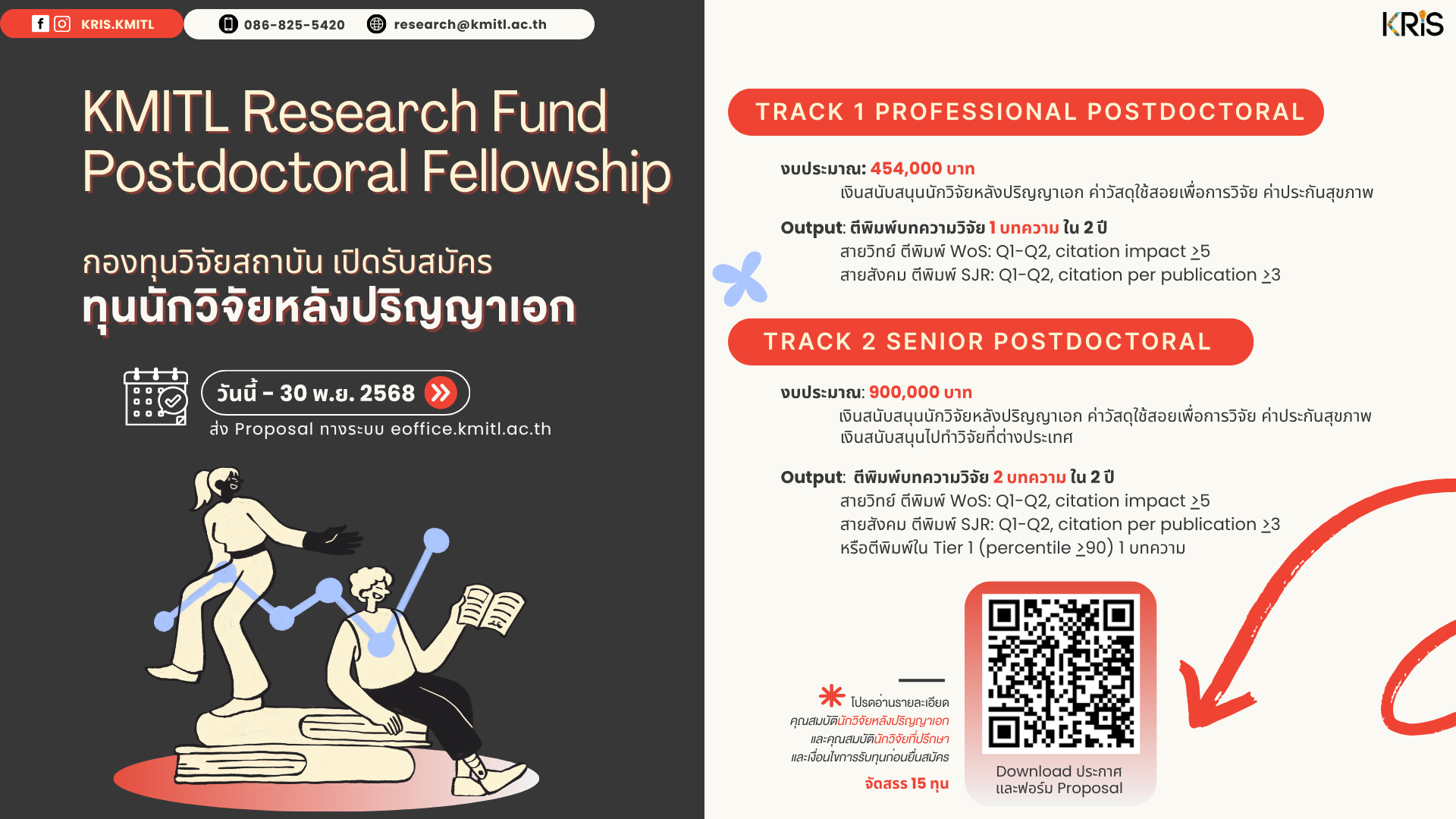 เปิดรับสมัครทุนนักวิจัยหลังปริญญาเอก (Postdoctoral Fellowship) ตั้งแต่บัดนี้ ถึง 30 พฤศจิกายน 2568 ส่งข้อเสนอโครงการทางระบบ eoffice.kmitl.ac.th Track 1 Professional Postdoctoral งบประมาณ 454,000 บาท (เงินสนับสนุนนักวิจัยหลังปริญญาเอก/ค่าวัสดุใช้สอยเพื่อการวิจัย/ค่าประกันสุขภาพ) ต้องตีพิมพ์ 1 บทความ ใน 2 ปี สายวิทย์ ตีพิมพ์ WoS: Q1-Q2,citation impact > 5